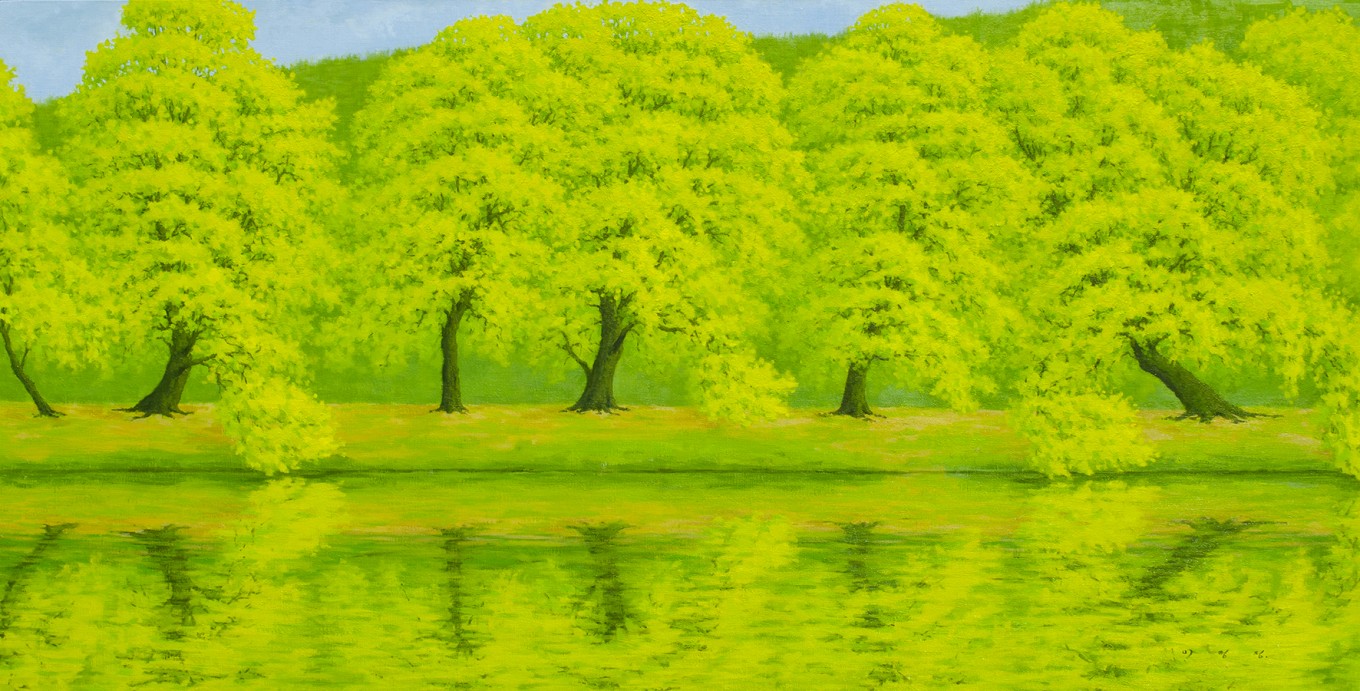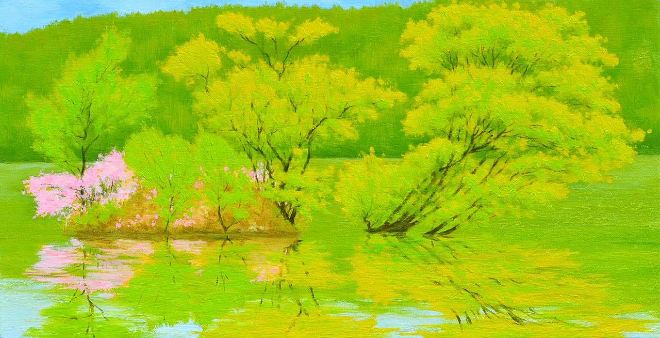 둘째는 물의 반영(反影)이다. 어릴 적 친구와 대나무를 잘라 낚싯줄을 메어서 강가에 나가 낚시를 하곤 했다. 그러나 커가면서 학업 때문에 자연스럽게 멀어졌고, 대학 졸업 후 낚시를 잊고 살았다, 그런 어느 날 대학 선배와 낚시를 같이 가게 되었고 낚시를 다시 시작했다. 일상의 피곤한 생활과 스트레스를 낚시로 풀어갔다. 그런데 어느 순간 낚시는 물고기가 아닌 그림의 소재를 찾기 위한 낚시로 변해가고 있었다. 잔잔한 물가의 반영된 수목들은 나로 하여금 그림으로 표현하게 만들었고 그렇게 지금의 “반영”은 시작되었다. 대구를 중심으로 근교에 있는 저수지는 낚시를 가기 위해서가 아닌 스케치를 위해 찾아 나선다. 이름도 모르는 낯선 저수지에서 내가 그리고자하는 풍경을 찾아다닌 지 십여 년은 족히 된 듯하다. 이제는 낚시가 아닌 작품의 소재를 찾아서 아름다운 무명 소류지를 찾아다니고 있다. 본 출품작은 경산시 소재의 반곡지 버들의 반영을 그린 것이다.