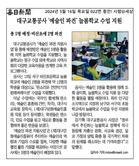 [보도자료]대구교통공사, '예술인파견 지원 사업'으로 늘봄학교 수업 지원