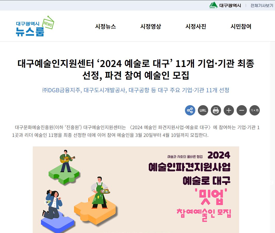 - [보도자료]대구예술인지원센터 ‘2024 예술로 대구’ 11개 기업·기관 최종 선정, 파견 참여 예술인 모집