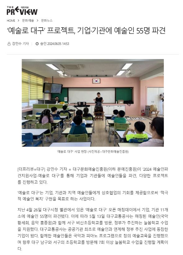 - [2024 보도자료]‘예술로 대구’ 프로젝트, 기업·기관에 예술인 55명 파견