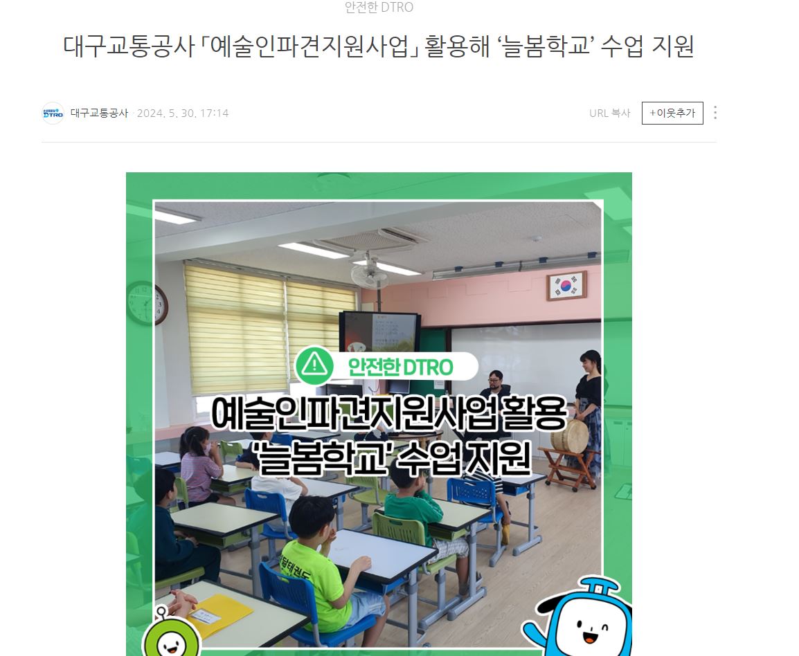 - [대구교통공사공식블로그]대구교통공사 「예술인파견지원사업」 활용해 ‘늘봄학교’ 수업 지원
