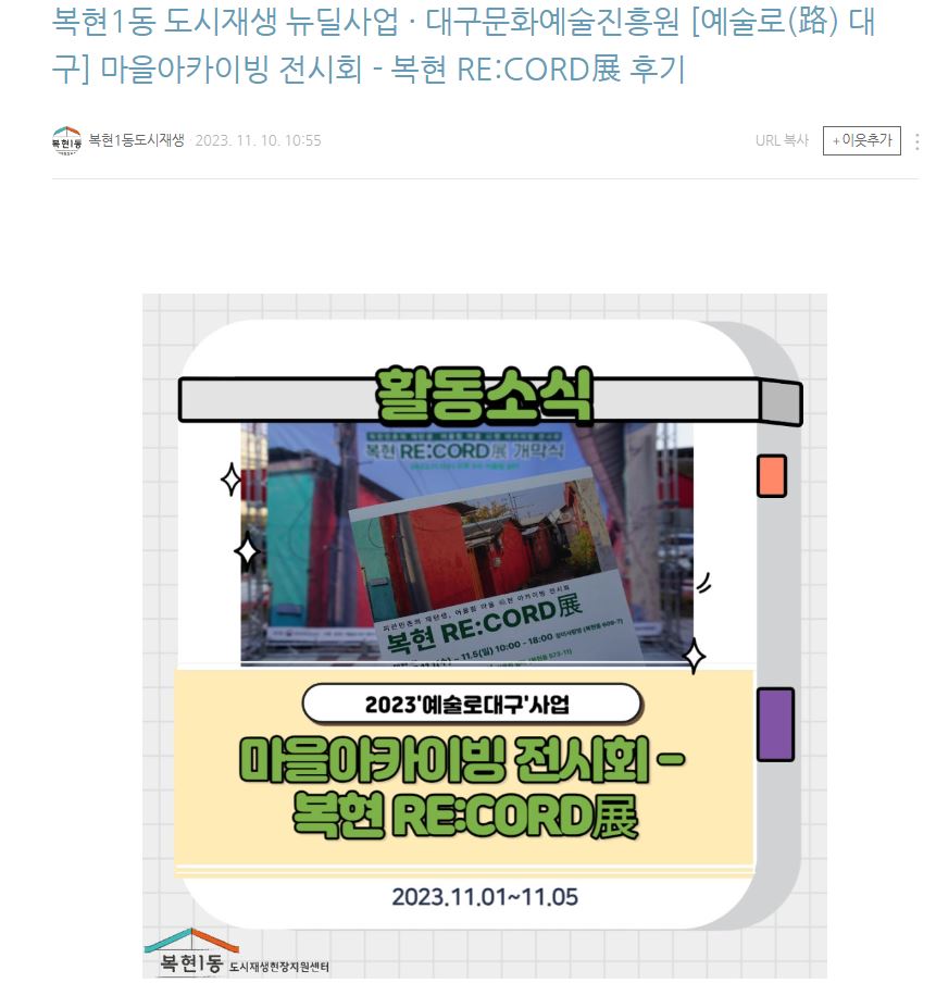 - [블로그]복현1동 도시재생 뉴딜사업 · 대구문화예술진흥원 [예술로(路) 대구] 마을아카이빙 전시회 - 복현 RE:CORD展 후기 [출처] 복현1동 도시재생 뉴딜사업 · 대구문화예술진흥원 [예술로(路) 대