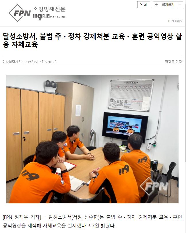 - [보도자료]달성소방서, 불법 주ㆍ정차 강제처분 교육ㆍ훈련 공익영상 활용 자체교육