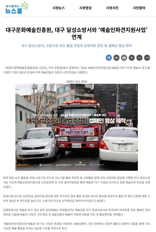 - [보도자료]대구문화예술진흥원, 대구 달성소방서와 ‘예술인파견지원사업’ 연계