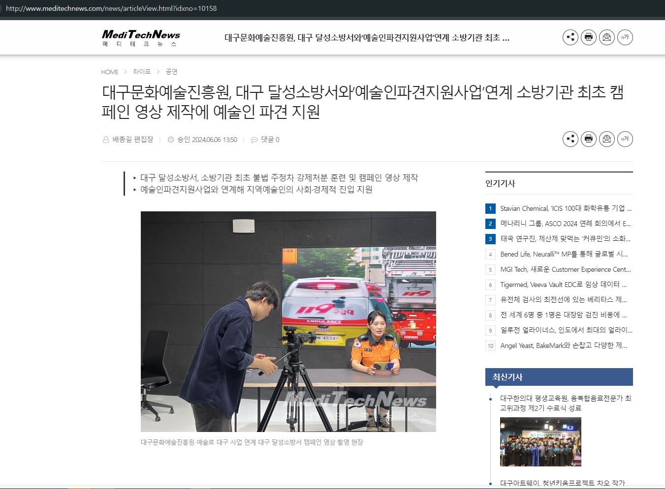 - [보도자료]대구문화예술진흥원, 대구 달성소방서와‘예술인파견지원사업’연계 소방기관 최초 캠페인 영상 제작에 예술인 파견 지원