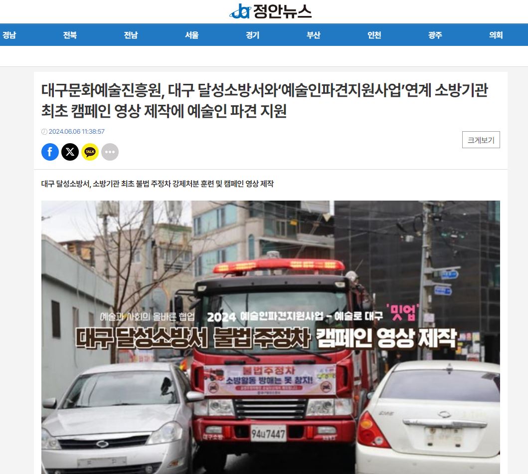 - [보도자료]LOGO 전국 대구 경북 경남 전북 전남 서울 경기 부산 인천 광주 의회 사회 교육 문화/행사 홈 대구공유하기 대구문화예술진흥원, 대구 달성소방서와‘예술인파견지원사업’연계 소방