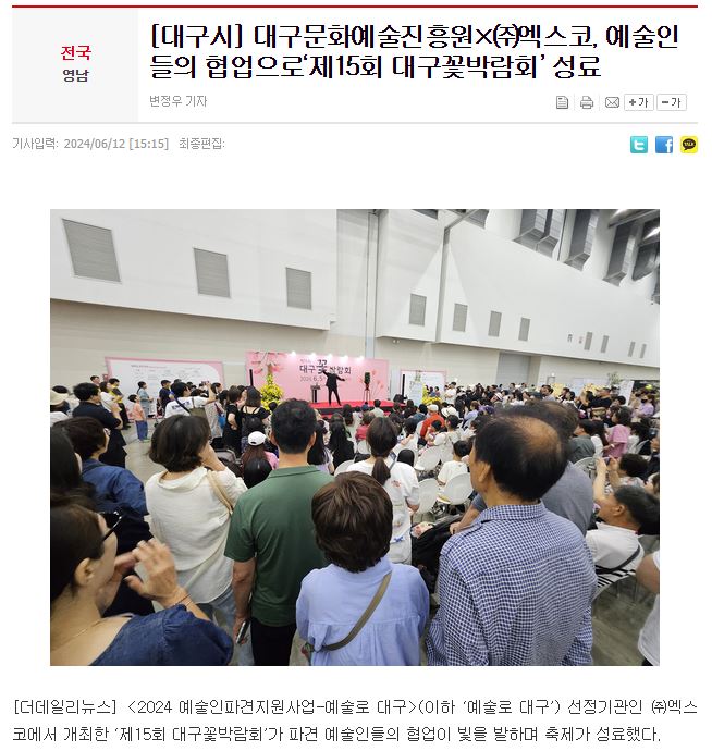 [더데일리뉴스] <2024 예술인파견지원사업-예술로 대구>(이하 ‘예술로 대구’) 선정기관인 ㈜엑스코에서 개최한 ‘제15회 대구꽃박람회’가 파견 예술인들의 협업이 빛을 발하며 축제가 성료했다. 올해 예술로 대구 선정기관인 ㈜엑스코에서 지난 5일(수)부터 8일(토)까지 4일간 ‘꽃, 365(Flower, 365)’를 주제로 ‘제15회 대구꽃박람회’를 개최했다. 대한민국 최대 실내 플라워쇼의 명성답게 총 38,874명(전년 대비 3% 증가)의 관람객이 전시장을 찾았다. 축제 4일 간 ㈜엑스코에 파견된 예술인(정세용(리더/시각예술), 안정수(음악), 전효영(마술), 신동인(시각예술), 송유식(음악))과 특별 출연자(정태영ㆍ신주연(음악))들은 전시장 메인 공연장인 블루밍 공연장에서 박람회 주제와 맞는 문화예술 공연을 펼쳤다. 예술인들이 선보인 마술, 클래식(첼로, 피아노), 인디밴드, 대중음악 공연이 다채로운 화훼작품과 어우러지며 관람객에게 큰 호응을 얻었다. ㈜엑스코와 ‘예술로 대구’ 예술인들의 협업은 10월 말일까지 지속된다. 전시장 내·외부 유휴공간에도 다양한 예술 콜라보가 진행될 예정 이어서 엑스코를 찾는 시민들의 문화 향유 기회를 더욱 넓힐 것으로 기대된다. 박순태 대구문화예술진흥원 문화예술본부장은 “엑스코가 예술로 대구 사업을 통해 전시 주최자, 참가자뿐만 아니라 시민과 방문객 모두를 위해 다양한 부대사업을 운영하며 미래가치를 선도하는 지역 대표 전시컨벤션센터이자 문화예술 플랫폼 역할을 수행하는 거점으로 자리매김할 것이라 기대된다”며, “대구문화예술진흥원도 지역 예술인의 적극적인 협업으로 예술적 가치가 다양한 공간들을 풍성하게 채워나갈 수 있도록 지원에 앞장설 것이다”고 말했다. 본 사업과 관련한 예술협업 활동 프로젝트는 대구예술인지원센터(artistcenter.or.kr)홈페이지와 온라인 플랫폼 SNS (@daegu_asc)에서 확인할 수 있다. |