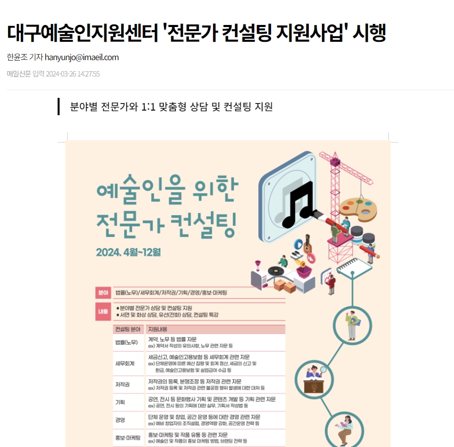 - [보도자료]대구예술인지원센터 '전문가 컨설팅 지원사업' 시행