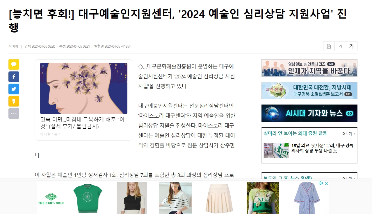 - [보도자료]대구예술인지원센터, '2024 예술인 심리상담 지원사업' 진행