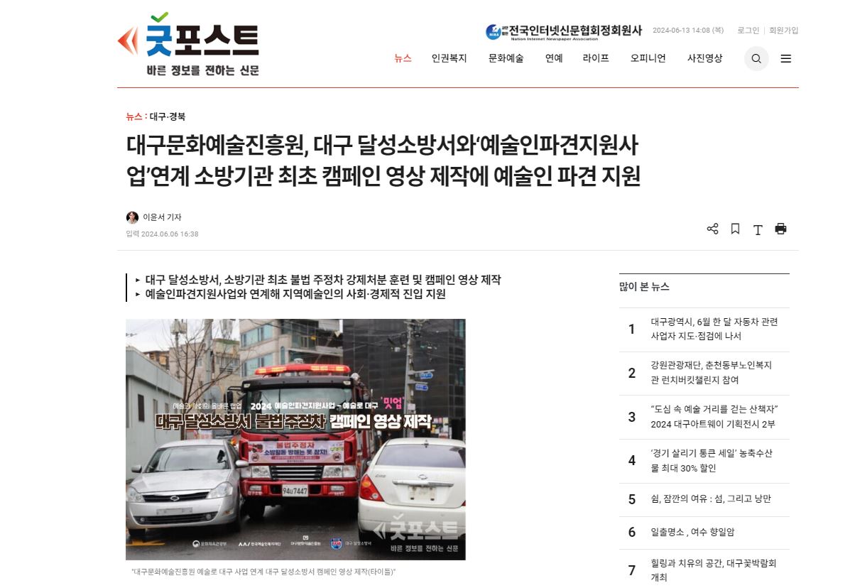 "대구문화예술진흥원 예술로 대구 사업 연계 대구 달성소방서 캠페인 영상 제작(타이틀)"《굿포스트》(재)대구문화예술진흥원(원장 김정길, 이하 진흥원)에서 운영하는 ‘2024 예술인파견지원사업-예술로 대구’(이하 예술로 대구)를 다양한 기업(기관)과 연계해 지역 예술인들의 직접적 사회 진입을 지원한다.