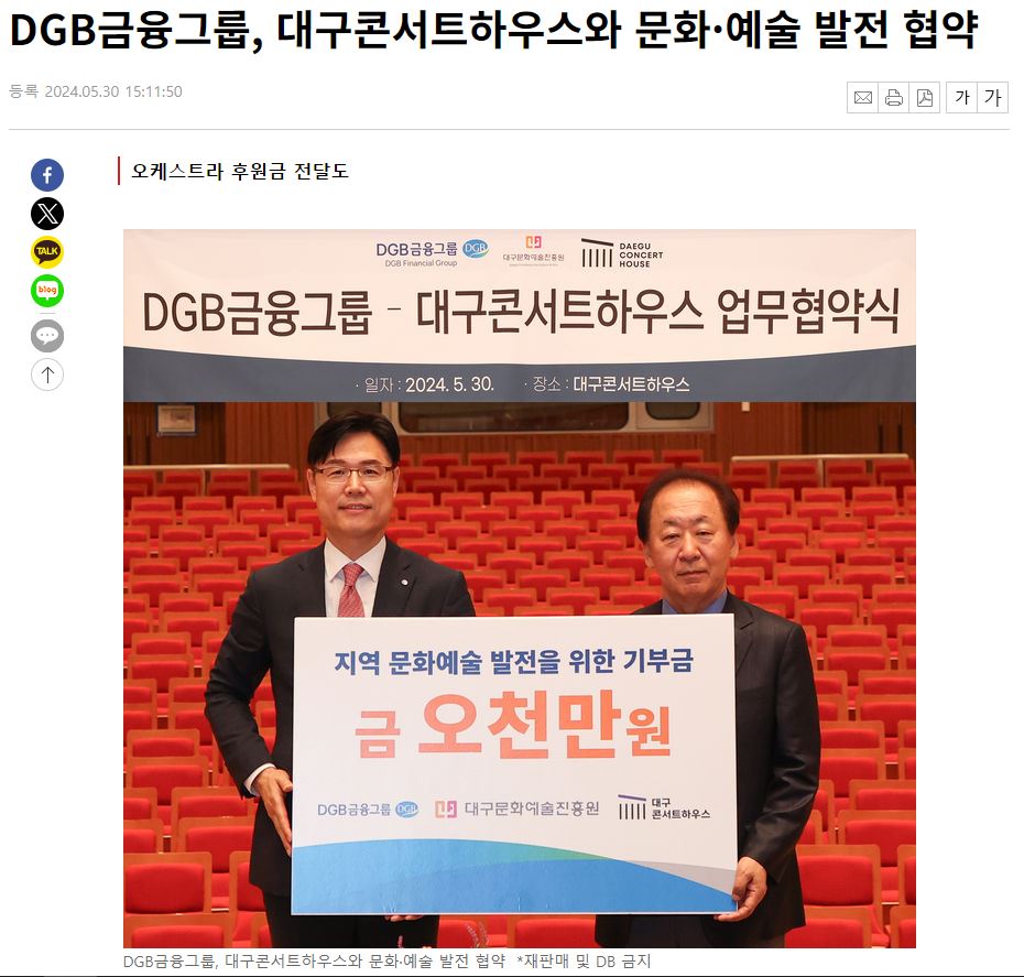 - [보도자료]2024 예술로 대구 선정기관 (주)DGB금융그룹X대구문화예술진흥원(대구콘서트하우스)협약