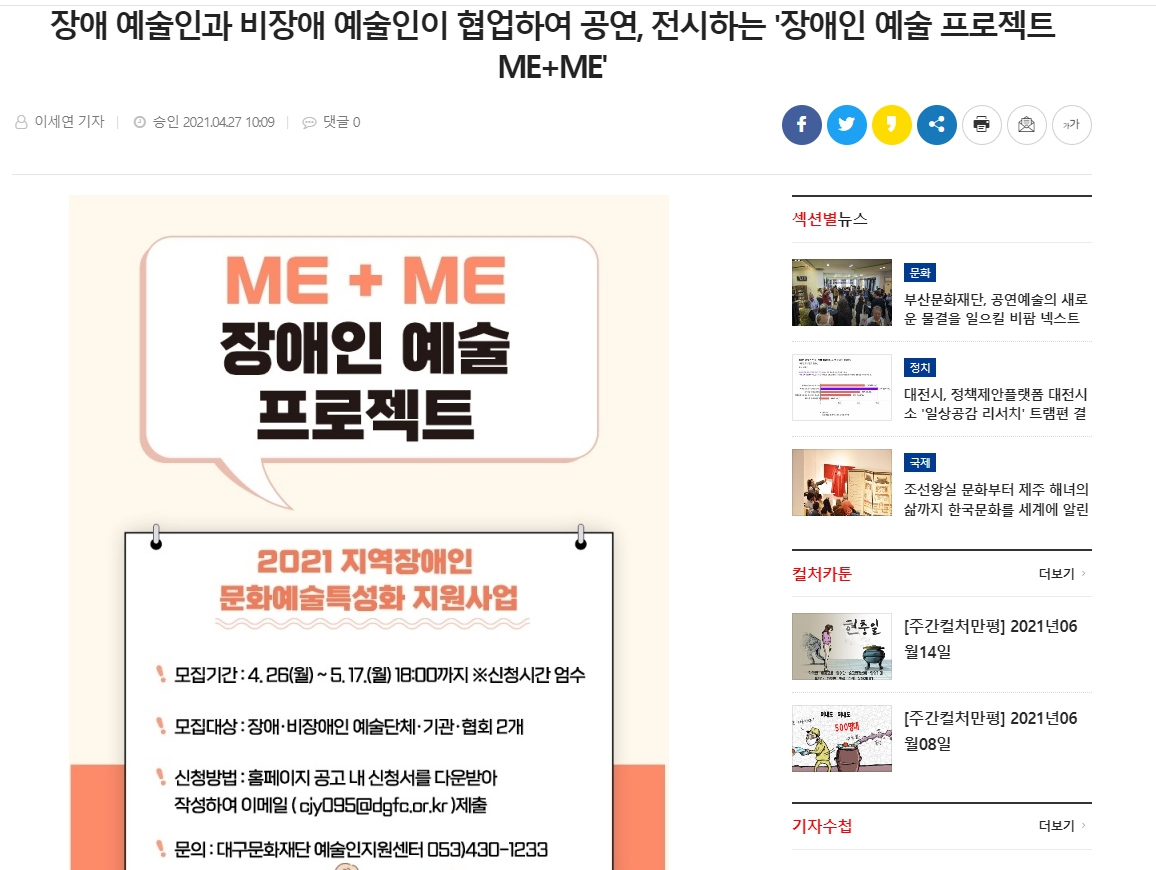 - [보도자료]장애 예술인과 비장애 예술인이 협업하여 공연, 전시하는 '장애인 예술 프로젝트 ME+ME'