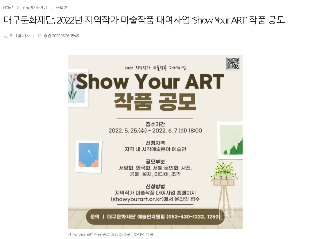- [보도자료]대구문화재단,2022년 지역작가 미술작품 대여사업 'show your ART' 작품공모
