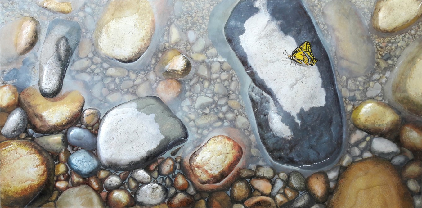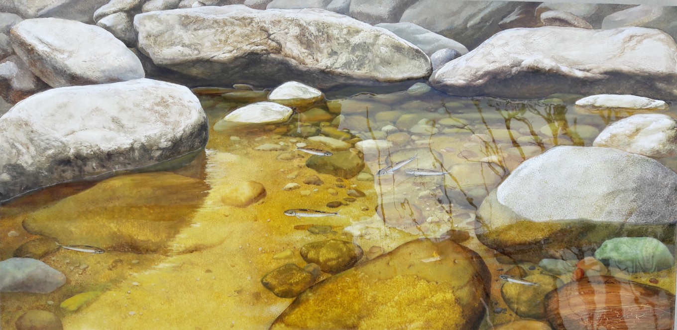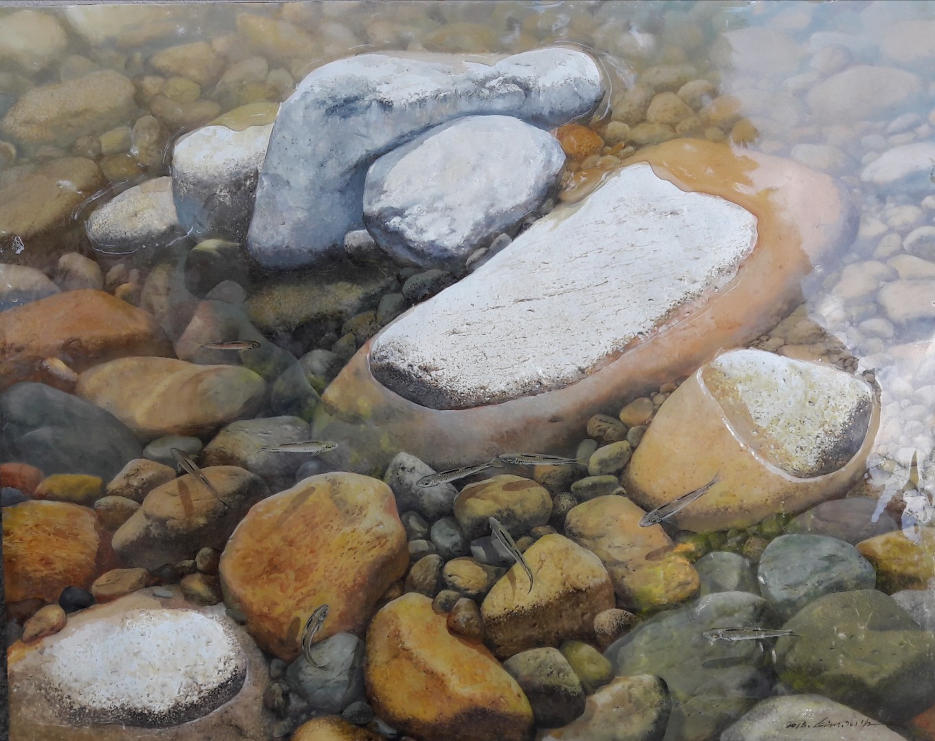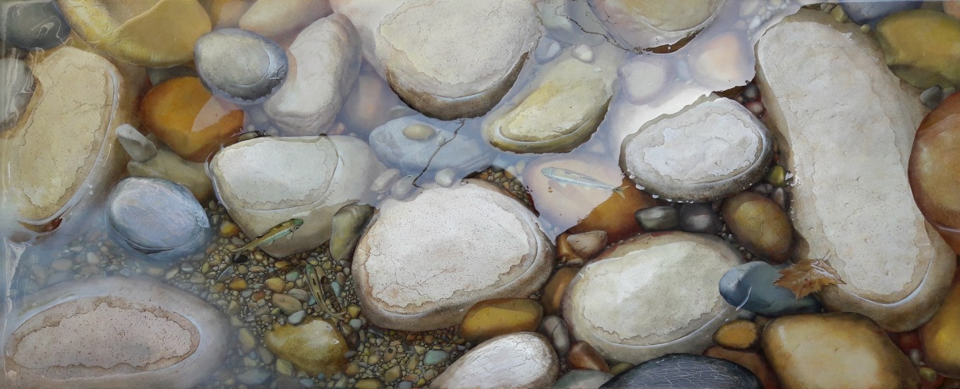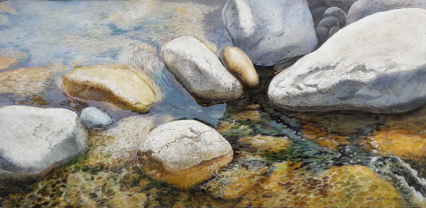 작가의 그림은 오랜 시간 서로 어루만지고 어깨를 겨누던 돌들을 감싸거나 돌에 기대어 또는 그 돌을 비켜 흐르는 물을 화면에 그리고 있다.