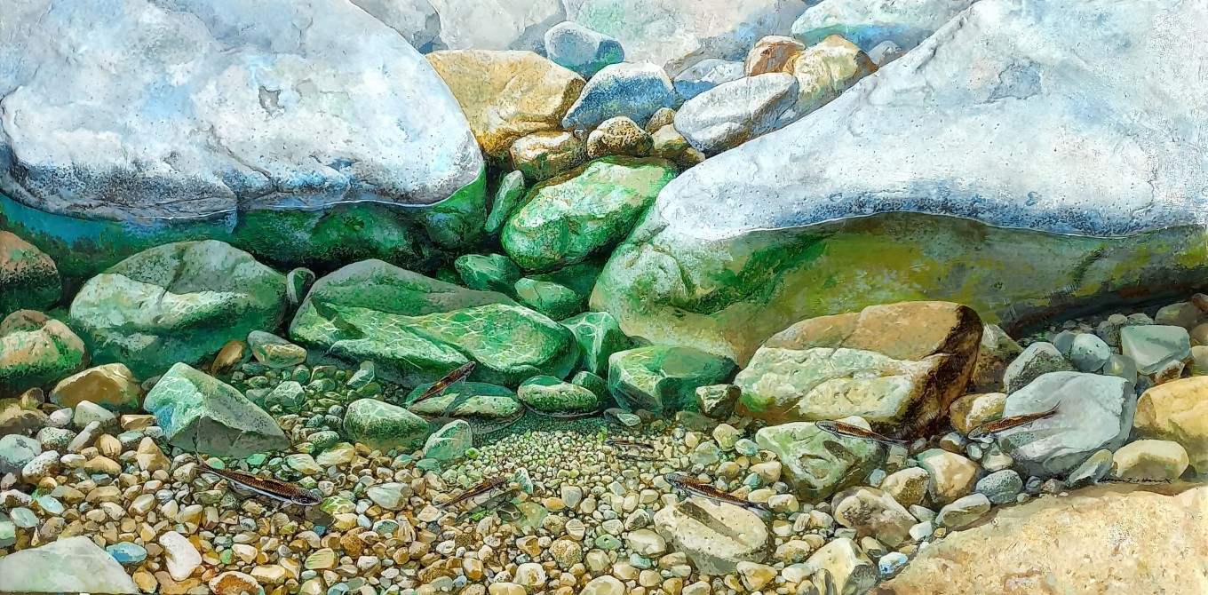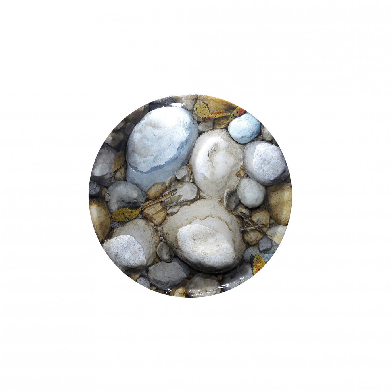 시냇물의 한 귀퉁이에 있는 모래톱, 조약돌, 그 돌을 받치고 있는 좀 큰 호박돌, 그 옆에는 더 큰 작은 바위 같은 돌이 화면에 있다.