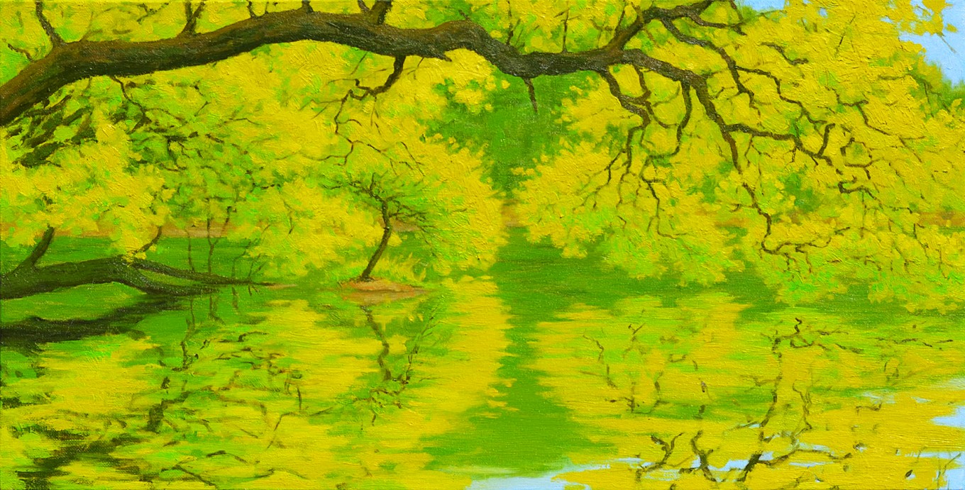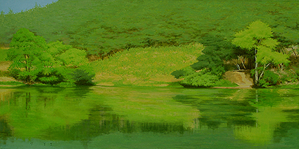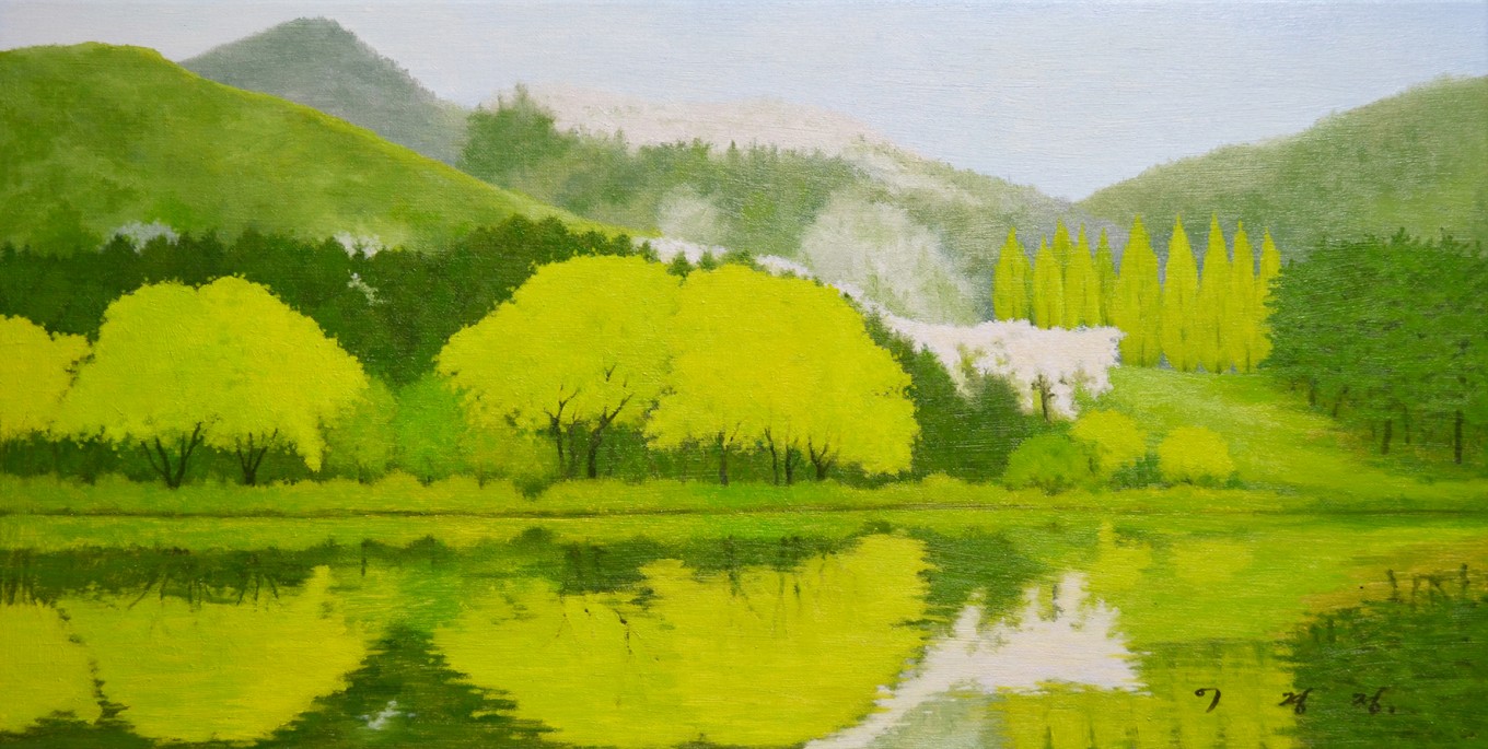 둘째는 물의 반영(反影)이다. 어릴 적 친구와 대나무를 잘라 낚싯줄을 메어서 강가에 나가 낚시를 하곤 했다. 그러나 커가면서 학업 때문에 자연스럽게 멀어졌고, 대학 졸업 후 낚시를 잊고 살았다, 그런 어느 날 대학 선배와 낚시를 같이 가게 되었고 낚시를 다시 시작했다. 일상의 피곤한 생활과 스트레스를 낚시로 풀어갔다. 그런데 어느 순간 낚시는 물고기가 아닌 그림의 소재를 찾기 위한 낚시로 변해가고 있었다. 잔잔한 물가의 반영된 수목들은 나로 하여금 그림으로 표현하게 만들었고 그렇게 지금의 “반영”은 시작되었다. 대구를 중심으로 근교에 있는 저수지는 낚시를 가기 위해서가 아닌 스케치를 위해 찾아 나선다. 이름도 모르는 낯선 저수지에서 내가 그리고자하는 풍경을 찾아다닌 지 십여 년은 족히 된 듯하다. 이제는 낚시가 아닌 작품의 소재를 찾아서 아름다운 무명 소류지를 찾아다니고 있다. 본 출품작은 경산시 소재의 반곡지 버들의 반영을 그린 것이다.