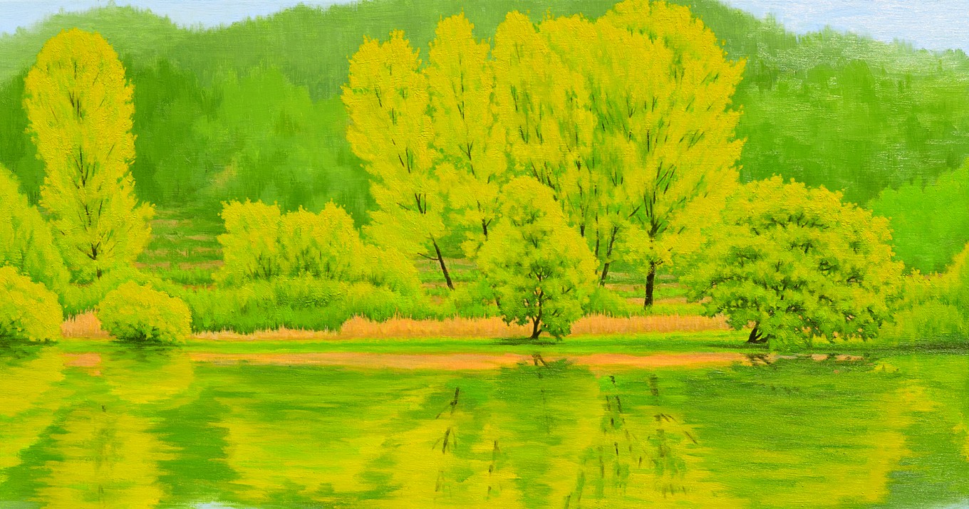 셋째는 색이다. 캔버스에는 온통 연두(lemon yellow)에서 짙은 초록(olive green)까지의 수만가지 색들이 어우러져 있다. 그 중에서 연두는 봄에 빠질 수 없는 색이 아닐까 생각한다. 새싹이 돋아날 때의 나무는 자연의 아름다움을 새삼 느끼게 해준다. 연두는 나에게 행복과 희망을 초록은 마음의 평안을 준다. 그리고 봄의 연둣빛은 풋풋한 어린아이의 마음을 닮은 듯, 때로는 어여쁜 여인의 순수함을 보는 듯하고, 초록의 절정으로 가기 위한 시작인 듯 하다. 봄의 초록은 여름의 초록과는 다르며 웃으며 손짓하는 어린아이의 모습인 듯(퍼머넌트 그린 라이트(permanent green light)색), 때로는 유혹하는 야릇한 여인의 향기인 듯하다. 그리고 안정과 성숙의 기운(퍼머넌트 그린(permanent green)에서 샙 그린(sap green)까지의 색)을 담고 있다.