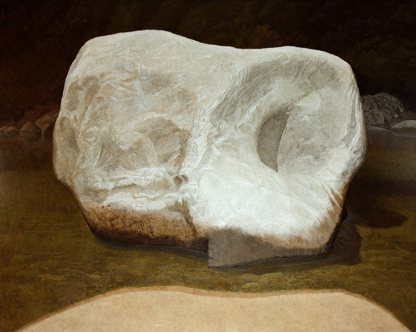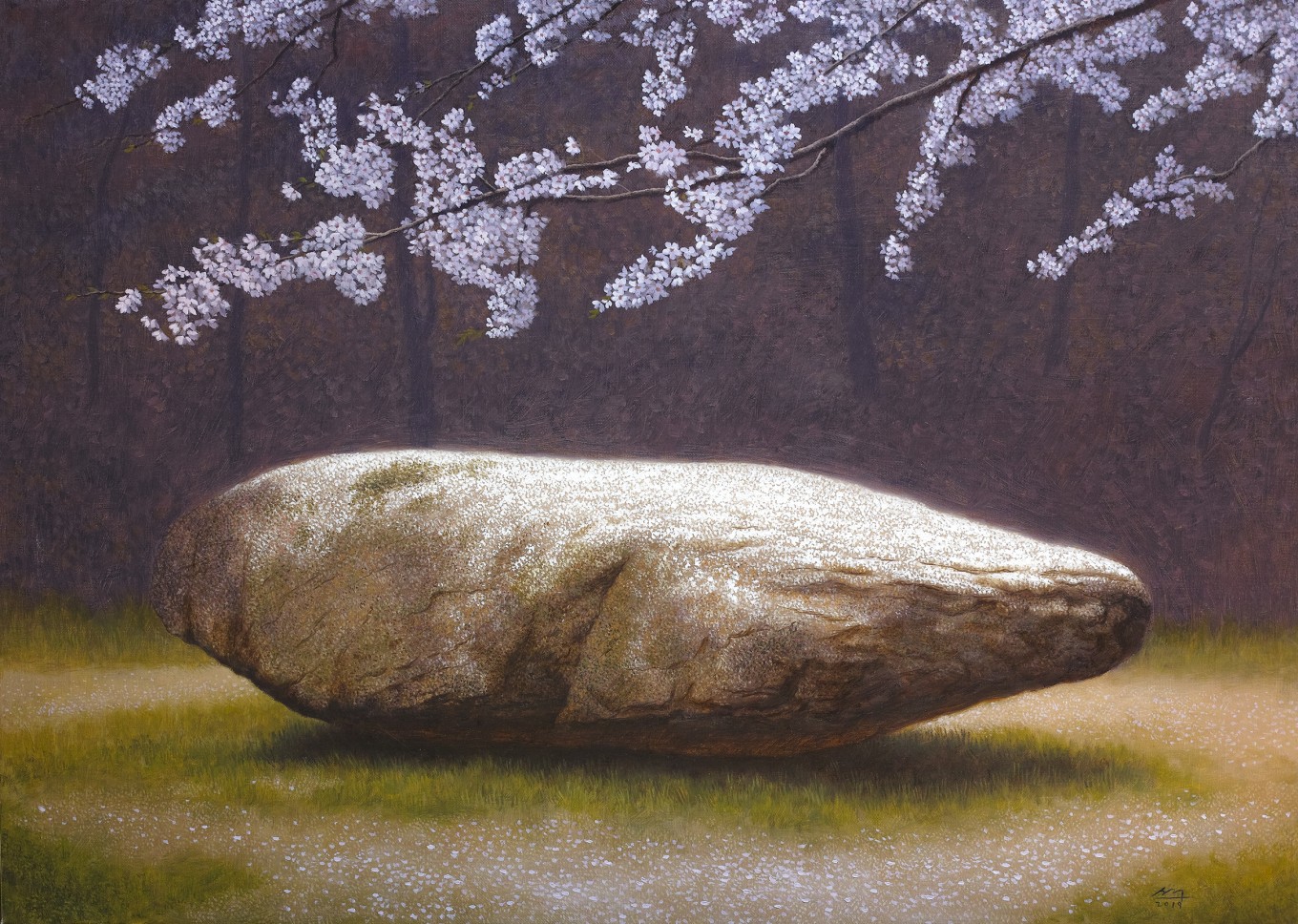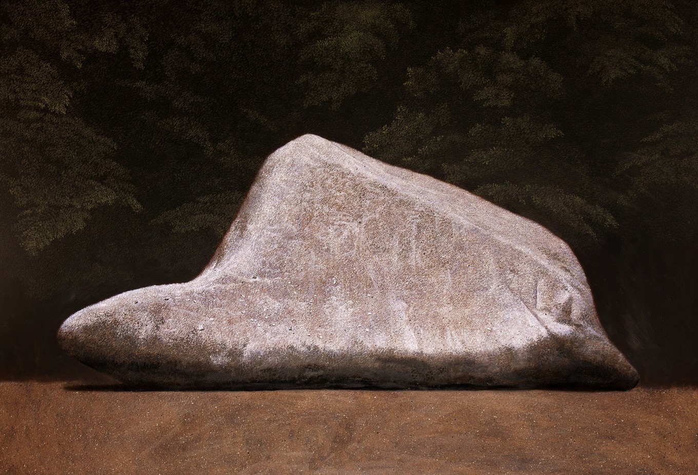 곽현석은 수고스레 많은 시간을 들여 만족할 만큼 점을 올리고 또 올린다. 그렇게 올린 점이, 그의 기준에서 대상의 본질에 근접할 때까지 그는 멈추지 않는다. 한마디로 곽현석의 작품은 지구의 지층을 빼닮았다. 작은 알갱이들이 퇴적되어 긴 시간에 걸쳐 단단히 굳어진 지층은 암석이 되고, 다시 쪼개어져 바위가 된다. 주로 인물을 그려온 곽현석이 인물이 아닌 대상으로 빈번히 작업해온 바위는 이렇게 그가 구사하는 유화기법과 절묘하게 연결된다. 그는 마치 바위를 이루는 모든 입자를 기필코 밝혀내겠다는 듯이 점()을 구축하고 있다.