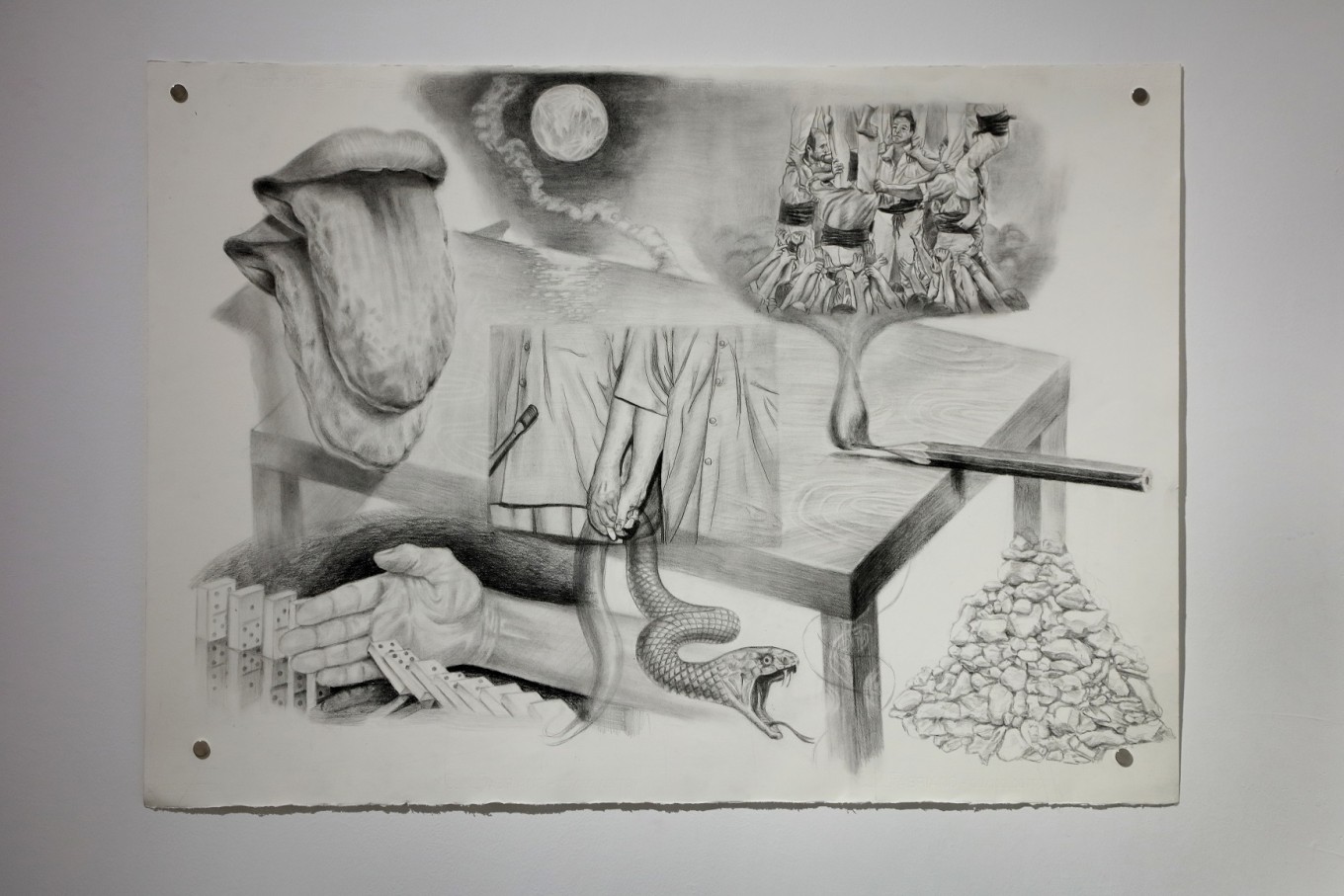 나의 작업은 비판적이지만 휴머니즘이 전제되어 있고, 외피에 대한 서술보단 심리와 감정에 천착하고 있다. 거개의 작품에서 우리가 무엇을 자각해야 하는지, 우리가 걷는 이 길이 과연 올바른 길인지 되묻는 자신만의 발언과 의제가 드러나고 사회, 정치적인 내용에서부터 흔하게 겪는 일상에서조차 그 알고리즘을 찾아내고 있음을 보여주려 한다. 나는 한국 사회 날것들, 내가 바라본 사회 속 인간관계 와 대인관계 속에서 일어나는 모습들을 듣고, 느끼고, 다시 되새기고, 정리하여 마지막 단계에 이야기들을 드로잉을 풀어낸다. 나-그림-감상자-사회 바라보기라는 단계별로 구분 지을 수도 있다.