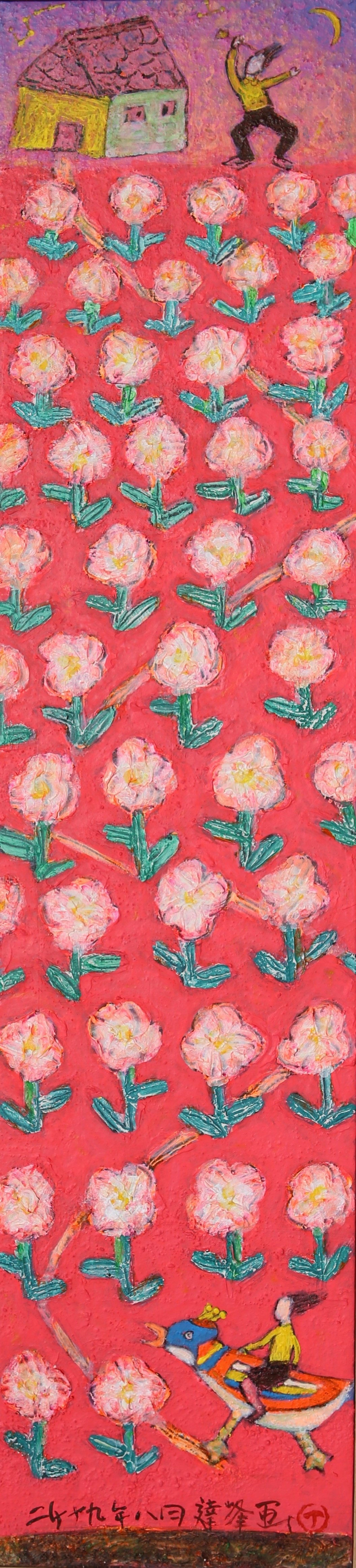 따라서 나의 그림은 자연과 더불어 시공의 순례를 통하여 평범한 인간들의 심성과 염원들을 민화, 무속적 이미지의 “호랑이, 새, 나비, 모란꽃, 사람, 사슴, 호수 등을 차용하여, 이념적이거나 미학적인 거창한 것들을 담으려 하기보다는, 지극히 평범한 인간들의 심성 즉, 기쁨과 슬픔, 꿈과 희망 그리고 고뇌와 기원, 사랑 등을 적색, 청.녹색 내지는 핑크색 바탕위에 해학적 은유적인 소박한 형상미로 서정성과 인간 내면의 기억을 함축적인 조형언어로 다양하게 상징화하는 작업을 화면에 풀어 놓았으며, 자아의 풍요와 삶의 자유로움을 영위 하고저 하는 소박한 희망과 어지럽게만 돌아가는 것처럼 보이는 우리 세상에서도 얼마든지 꿈꾸면......, 자연의 순수함으로의 동화와 안락의 세계가 열릴 수 도 있음을 염원하고 기대한다.