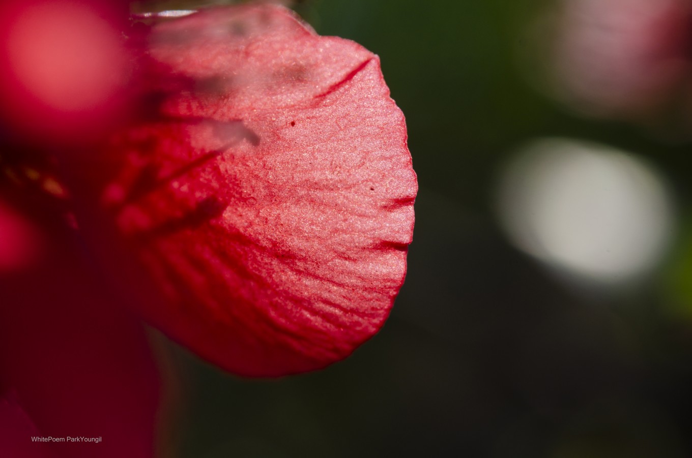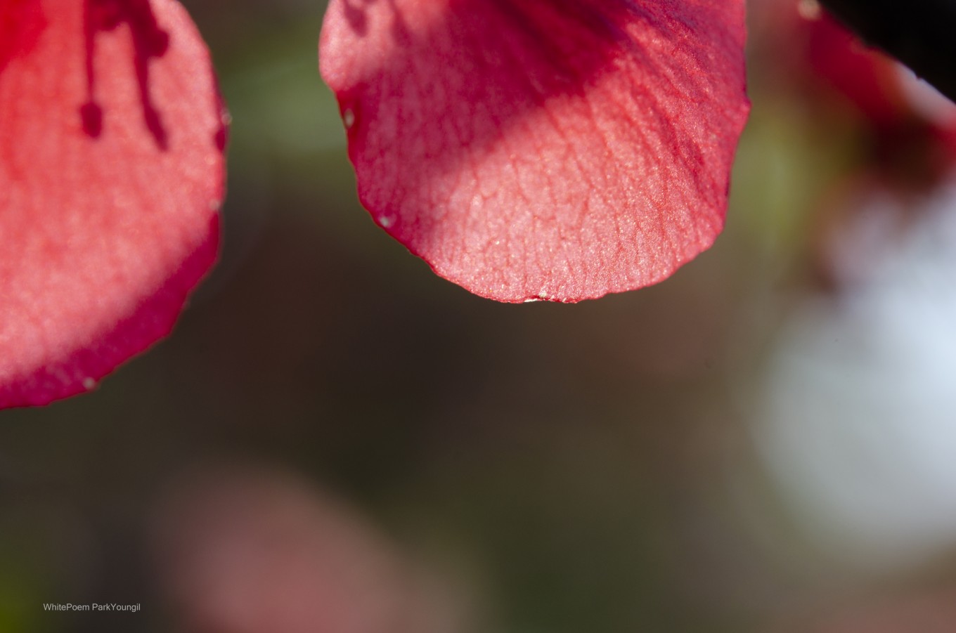 꽃잎 뒤에 태양을 가져다 둔다. 눈이 부셔서 바로 바라볼 수 없지만, 나는 강렬한 태양을 가득 포함 시킨다. 그러면 빨간 꽃은 속 마음을 이야기하기 시작한다. 바람이 시샘을 하면 꽃들의 이야기를 알아듣기 힘들어진다. 그 순간 태양은 웃음을 멈추고 침묵의 상태로 사라진다. 나는 이 경계를 오간다. 향기 가득한 아름다움이 다가온다. 이 행복한 순간의 이야기를 침묵의 여백에 기록한다. 빛으로 채워진 그곳에 글을 쓴다.