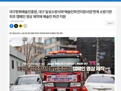 [보도자료]LOGO 전국 대구 경북 경남 전북 전남 서울 경기 부산 인천 광주 의회 사회 교육 문화/행사 홈 대구공유하기 대구문화예술진흥원, 대구 달성소방서와‘예술인파견지원사업’연계 소방