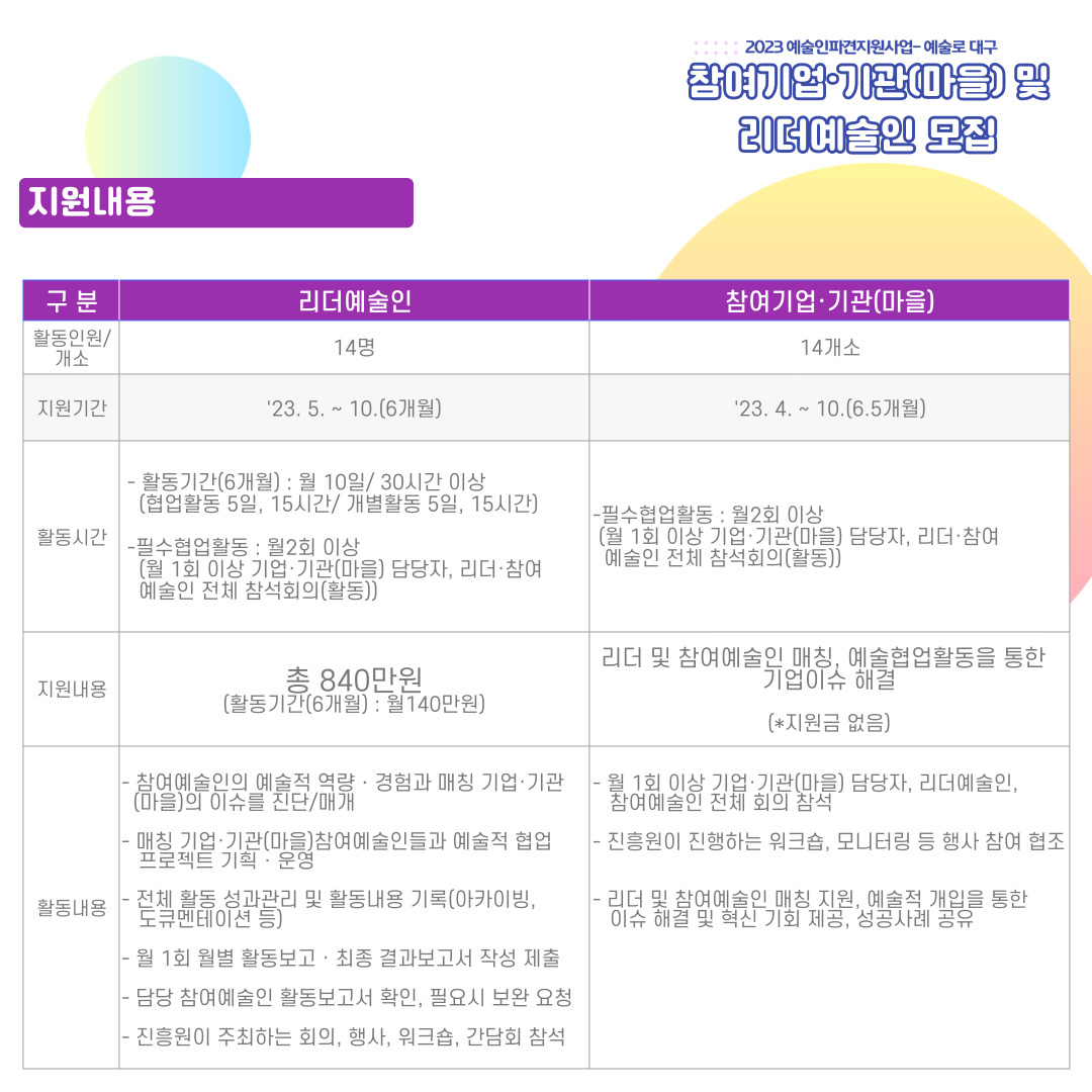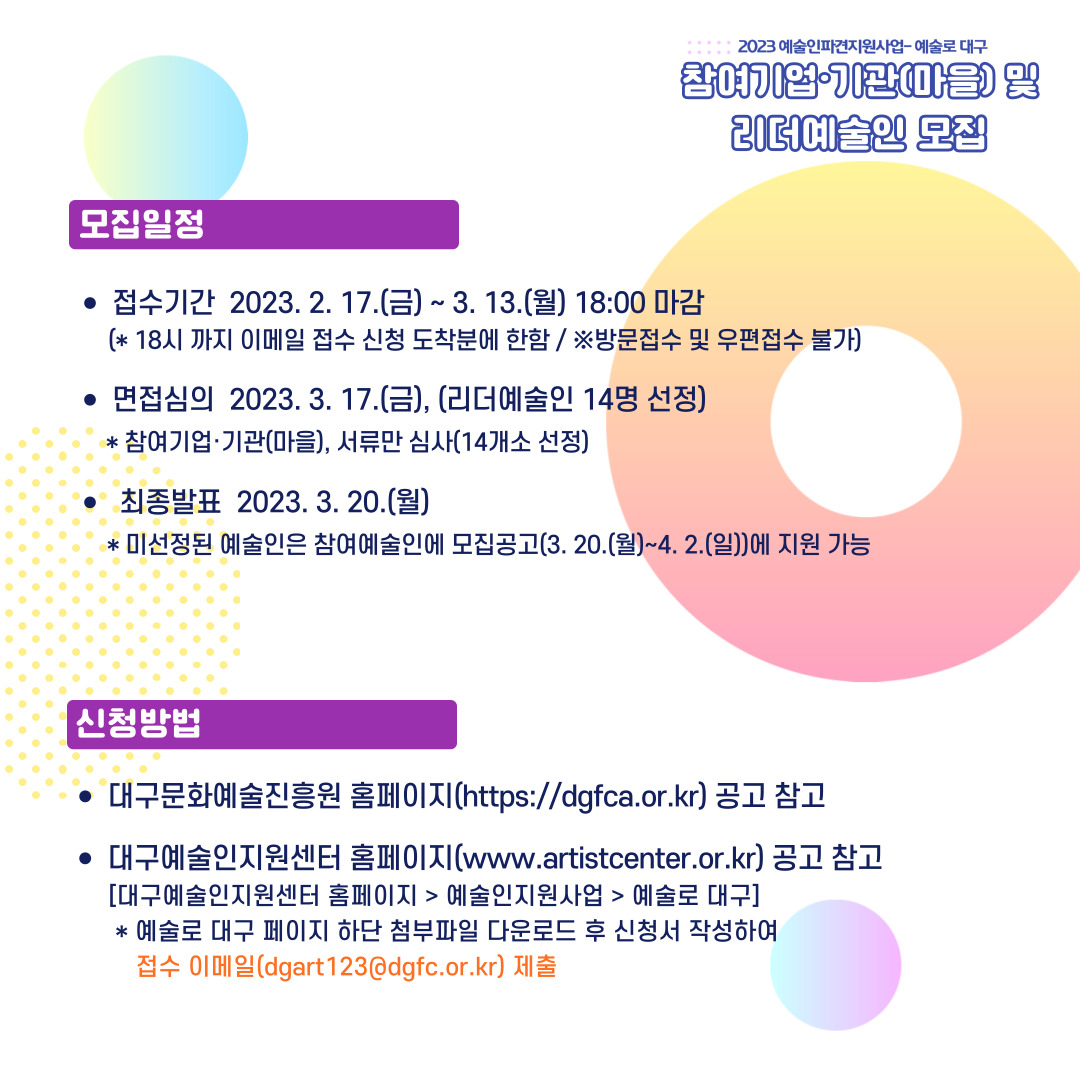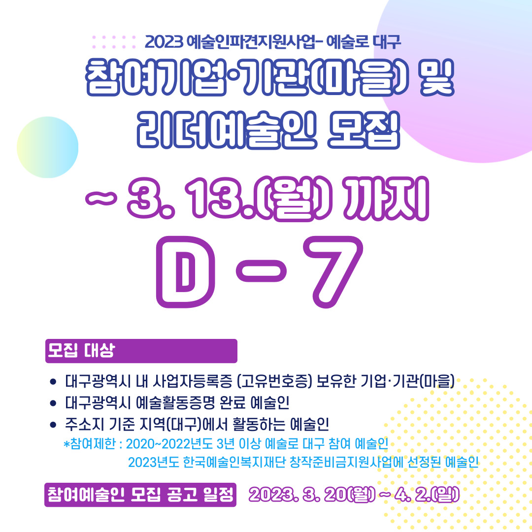 [종료] [2023 예술인파견지원사업-예술로대구] 참여기업·기관(마을)및 리더예술인 모집기간 3월 13일(월)까지