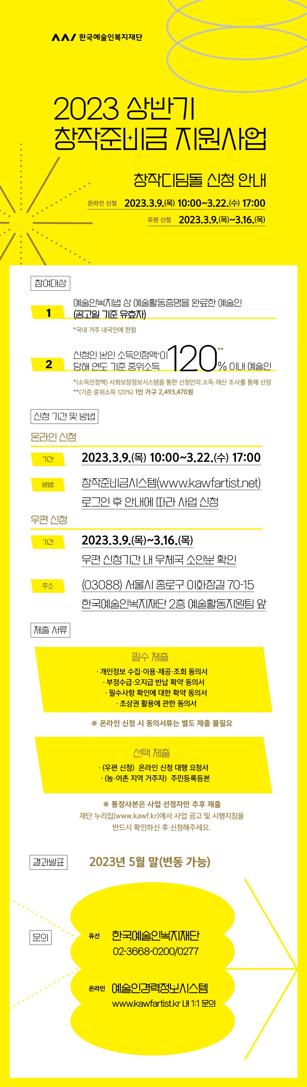 문의사항: 한국예술인복지재단 창작준비지원팀(02-3668-0277)