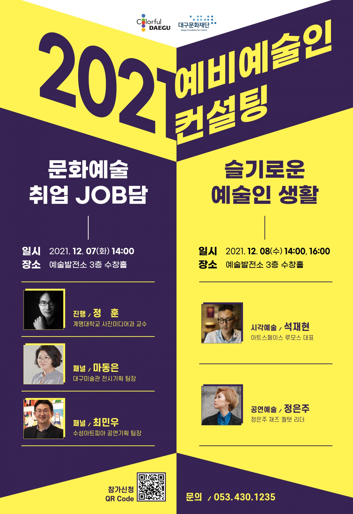 (재)대구문화재단 예술인지원센터는 예비예술인의 사회 진출 기회 창출과 예술직무역량 강화를 위한 「예비예술인 컨설팅」을 개최합니다. 지역 내 예비예술인들의 많은 관심과 참여 부탁드립니다. 2021년 11월 25일 (재) 대구문화재단 대표 |